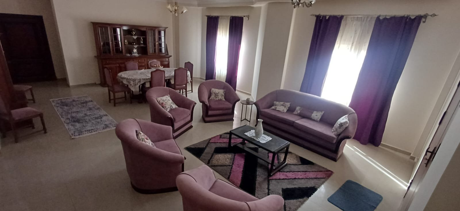 التقسيم الداخلي: ريسبشن واسع لاستقبال الضيوف، غرفة معيشة (Living Room) مستقلة، 3 غرف نوم مجهزة بالكامل، و3 حمامات بتشطيبات حديثة.