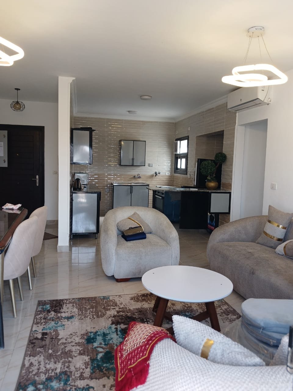 الأثاث: ريسبشن بفرش “مودرن” مريح، شاشة Smart TV، وغرف نوم بمراتب طبية وخزائن ملابس واسعة.