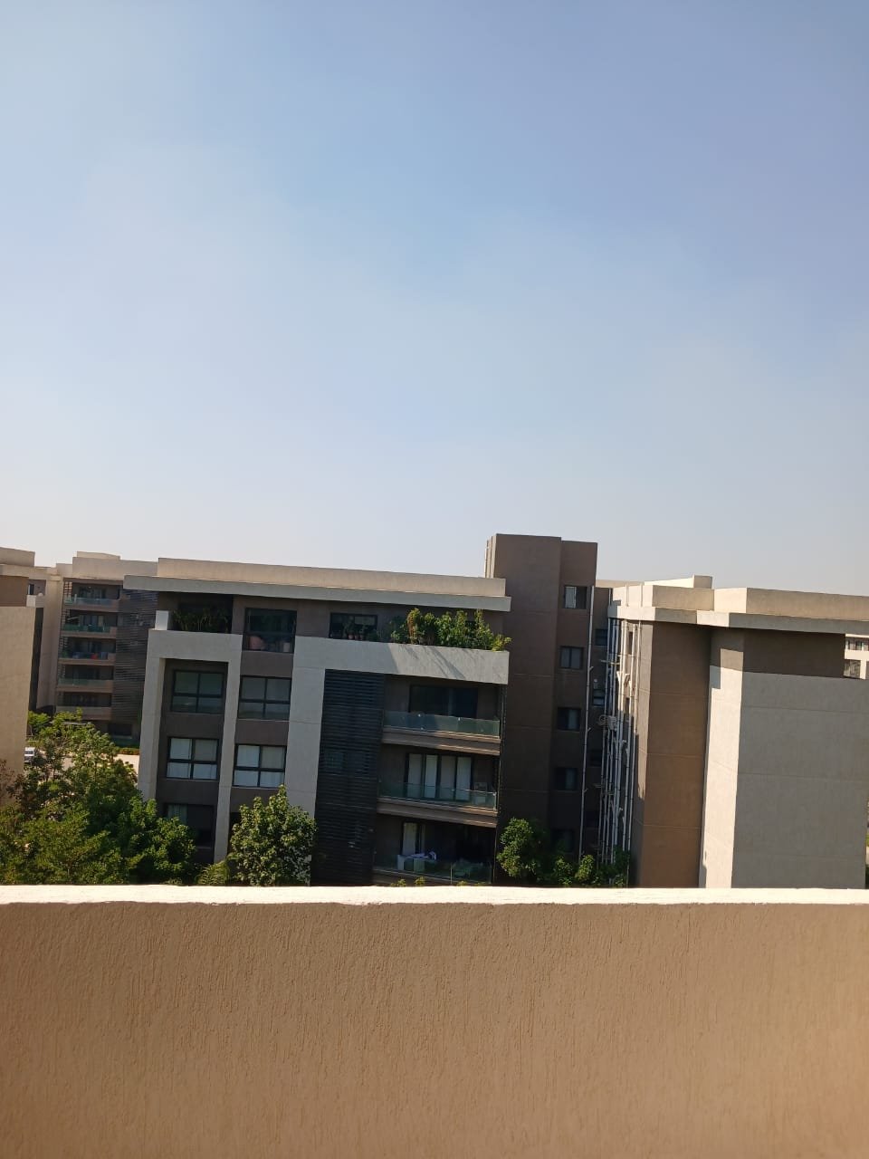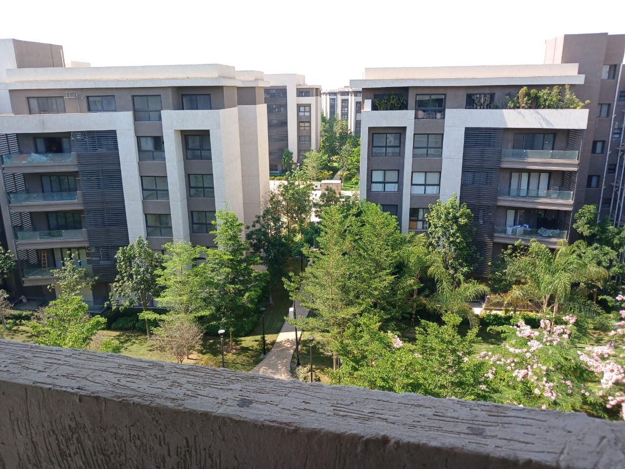 الإطلالة: شرفة واسعة تطل على مساحات خضراء “لاندسكيب” مفتوحة، مما يوفر تهوية وإضاءة طبيعية ممتازة.