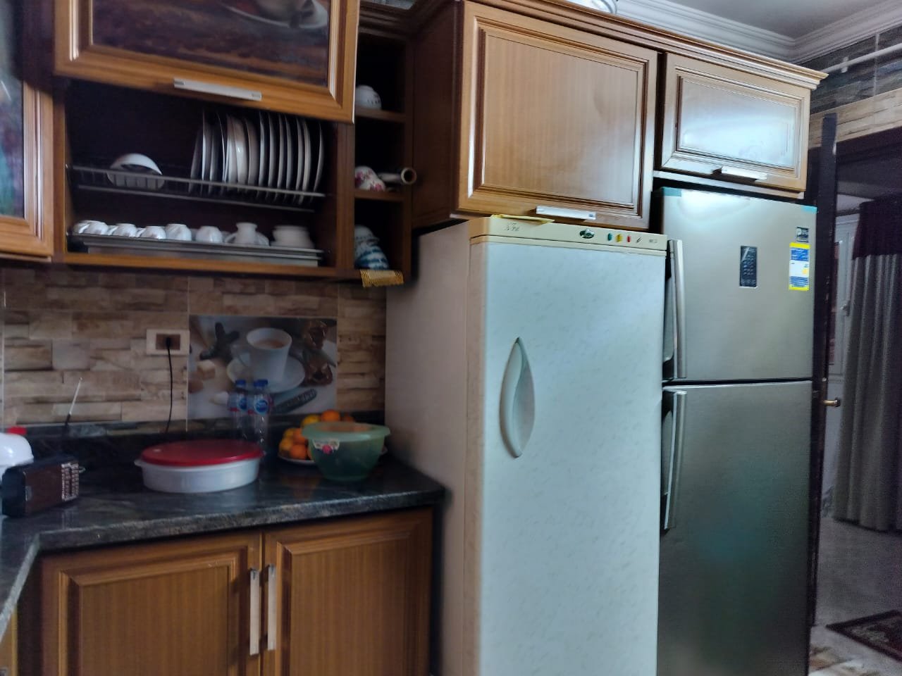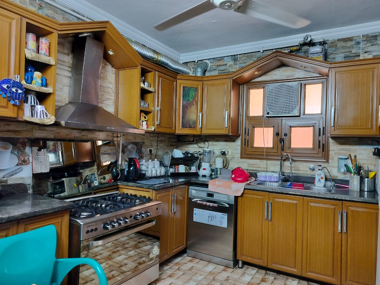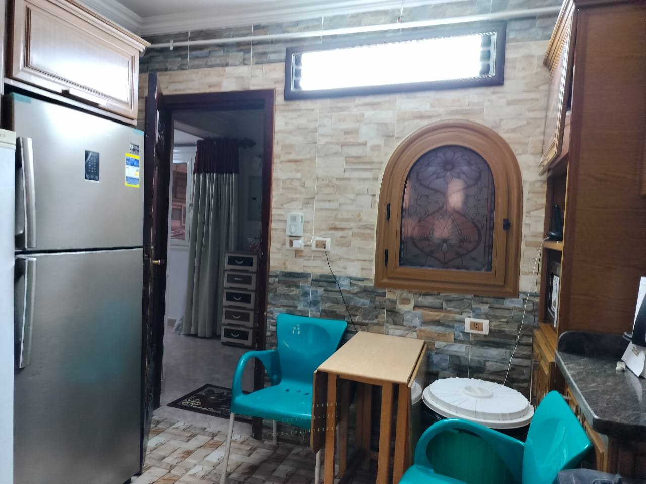 • مطبخ عصري: مطبخ خشمونيوم مجهز بالكامل يجمع بين أناقة الخشب ومتانة الألومنيوم.